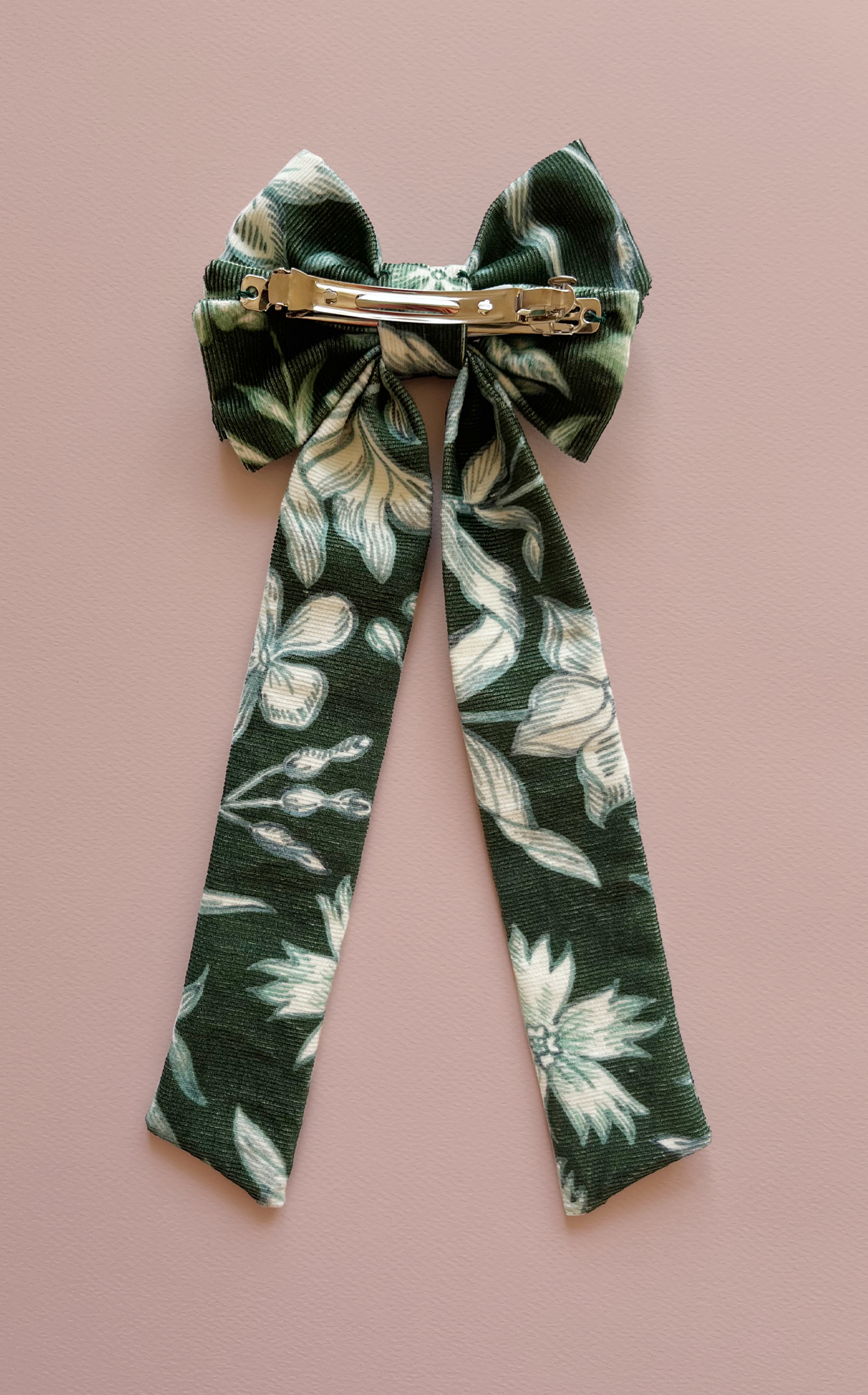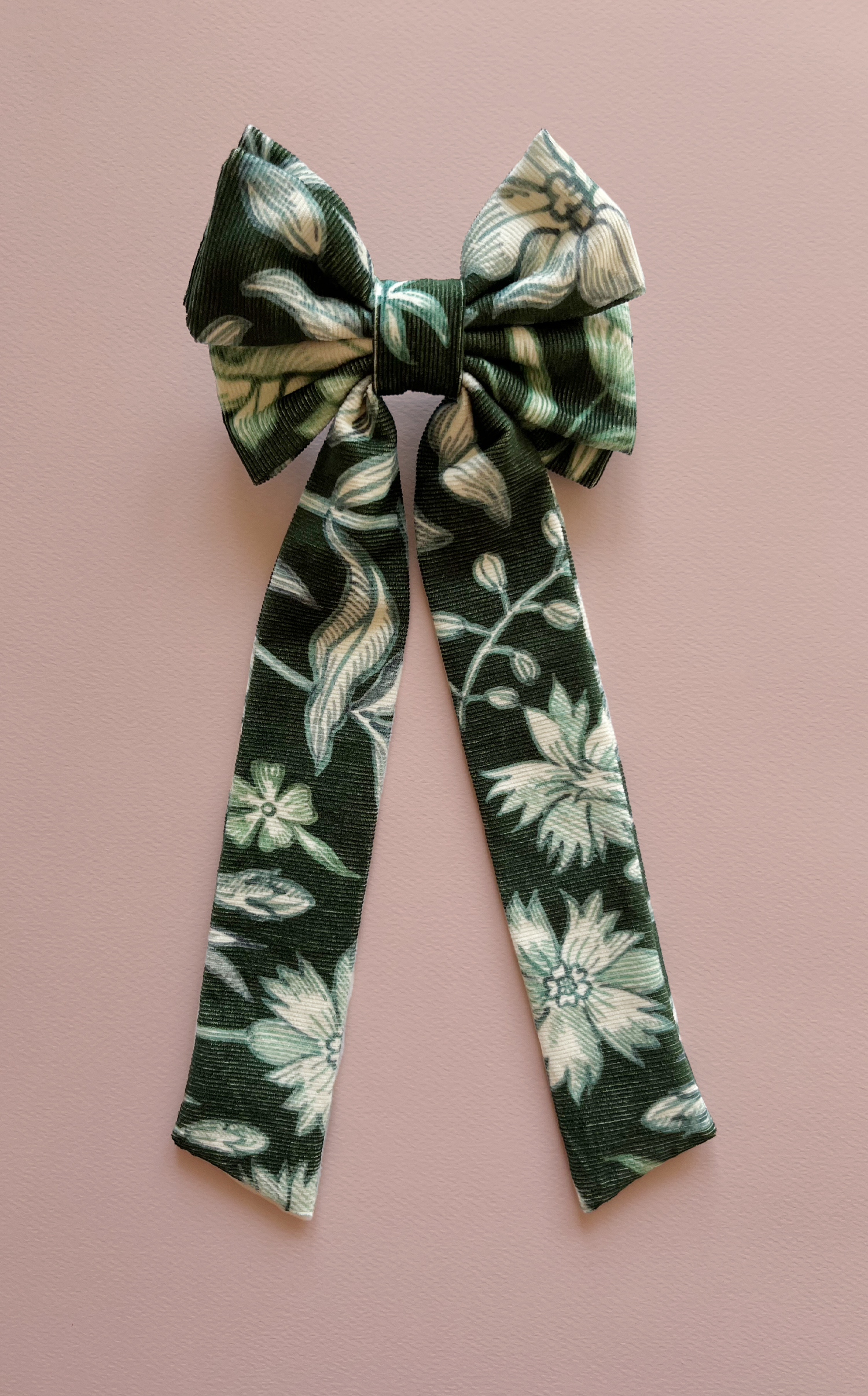A romantic hair bow crafted from soft floral corduroy. Designed with two flowing tails that drape gracefully, it adds a touch of charm and femininity to any hairstyle. Handmade with care, it’s a timeless accessory that blends vintage texture with everyday elegance.
