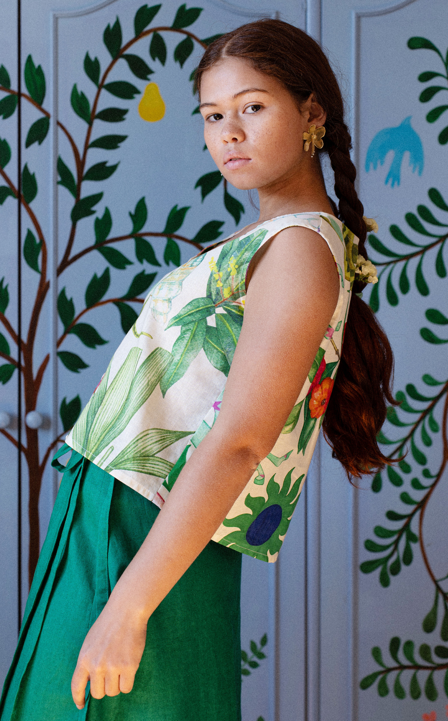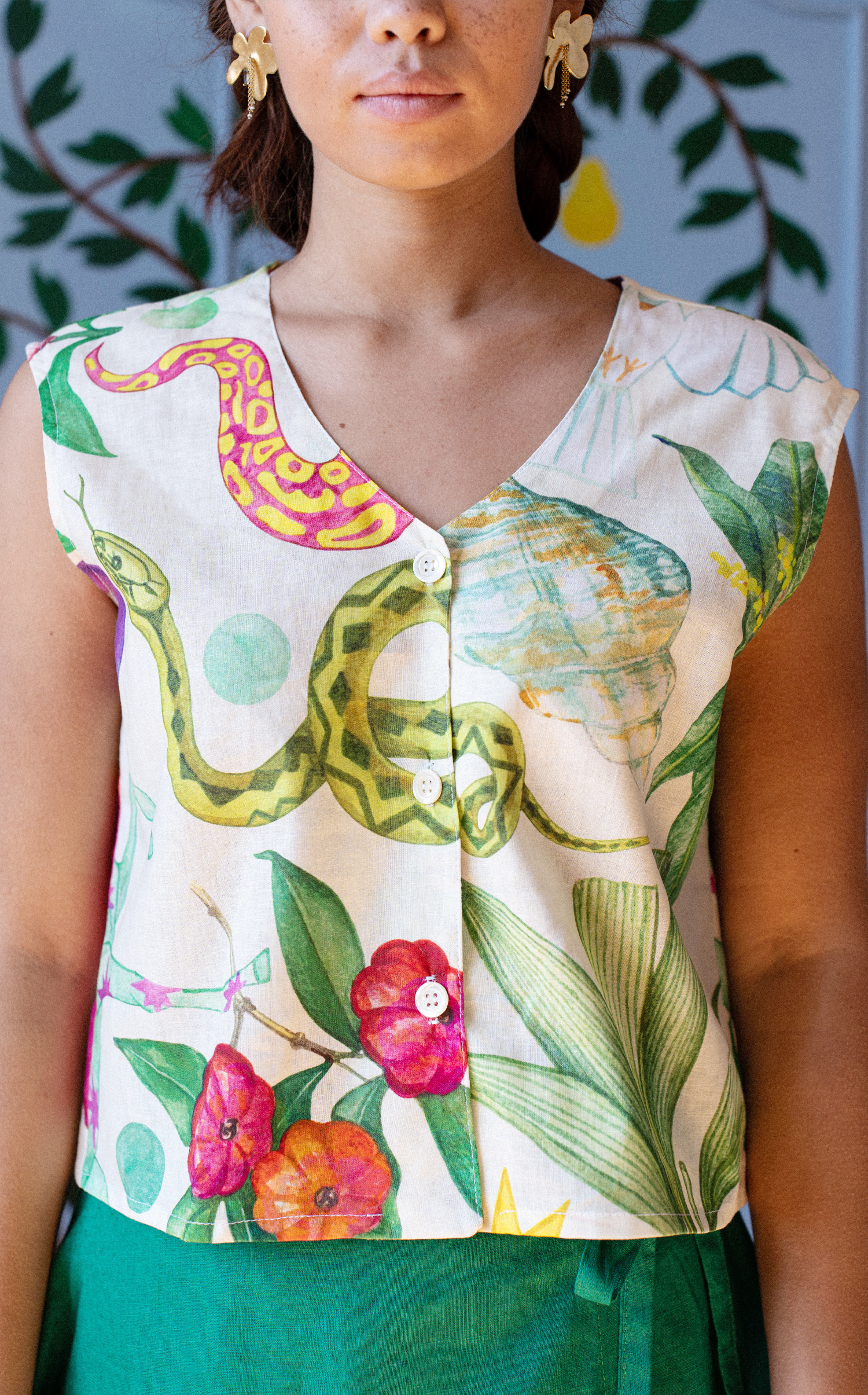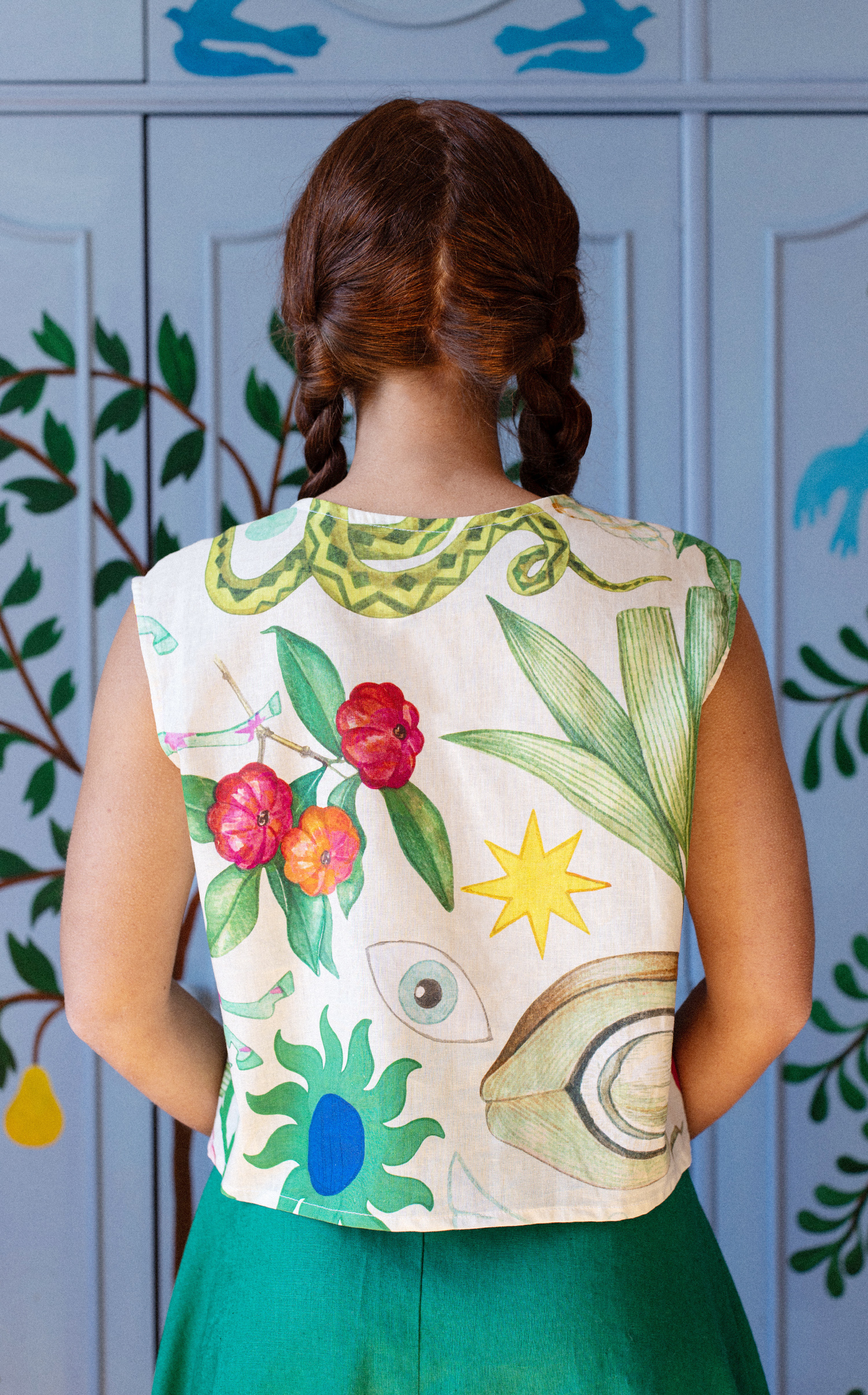 The print evokes a journey home—to Salvador—alive with color, memory, and rhythm, like a place that continues to pulse within. More than a top, it feels like something to carry with you: a vibrant, joyful amulet to wear.